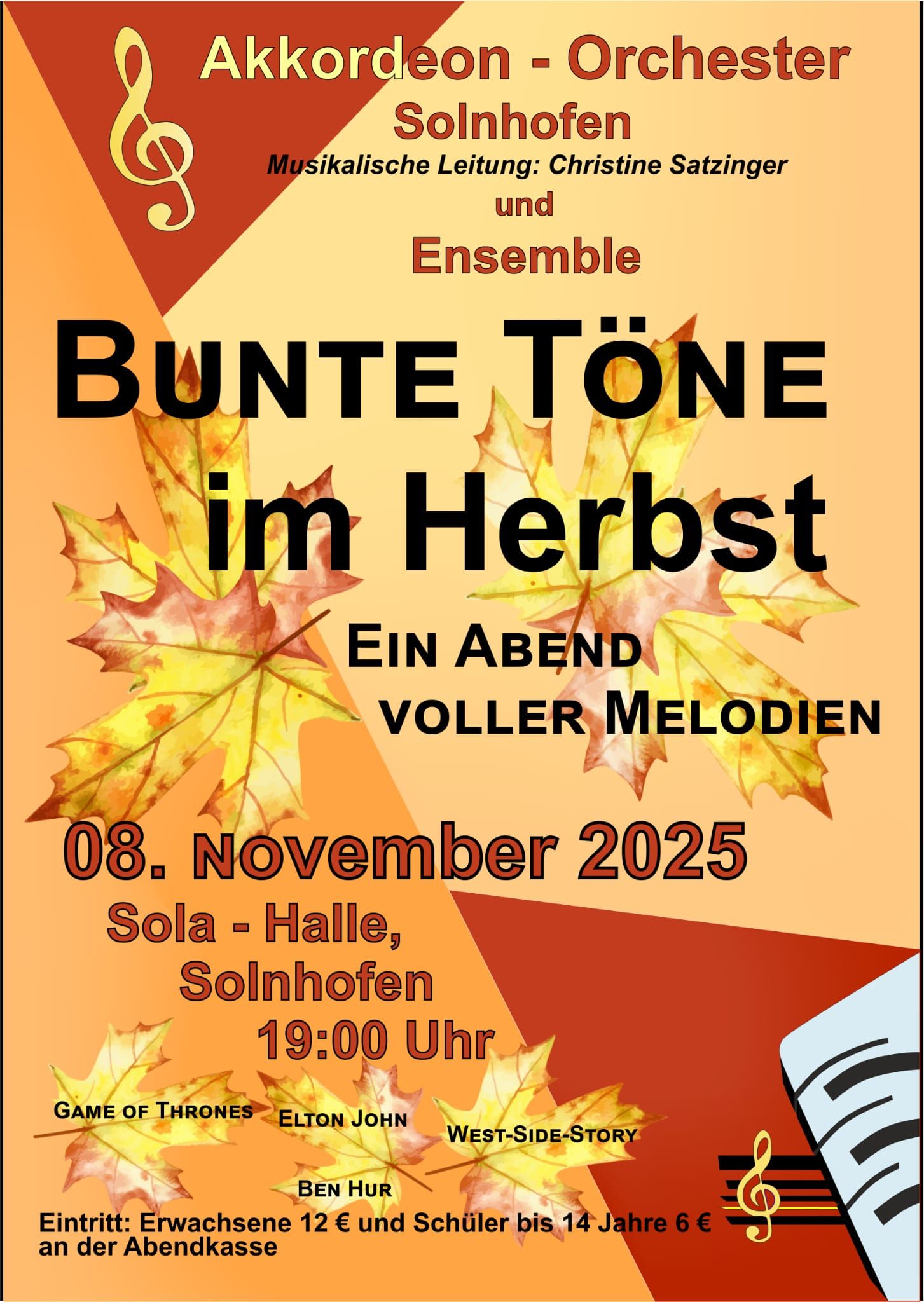 Am 8. November lädt das Akkordeon-Orchester Solnhofen unter der musikalischen Leitung von Dirigentin Christine Satzinger zu einem stimmungsvollen Herbstkonzert in die Sola-Halle ein. Ab 19 Uhr erwartet die Besucher eine Auswahl bekannter Melodien aus dem berühmten Musical West Side Story, Filmmusik aus Ben Hur und eine Auswahl berühmter Stücke von Elton John. Zusammen mit den Klängen des "Ensembles" dürfen sich die Gäste auf viele weitere musikalische Höhepunkte freuen.